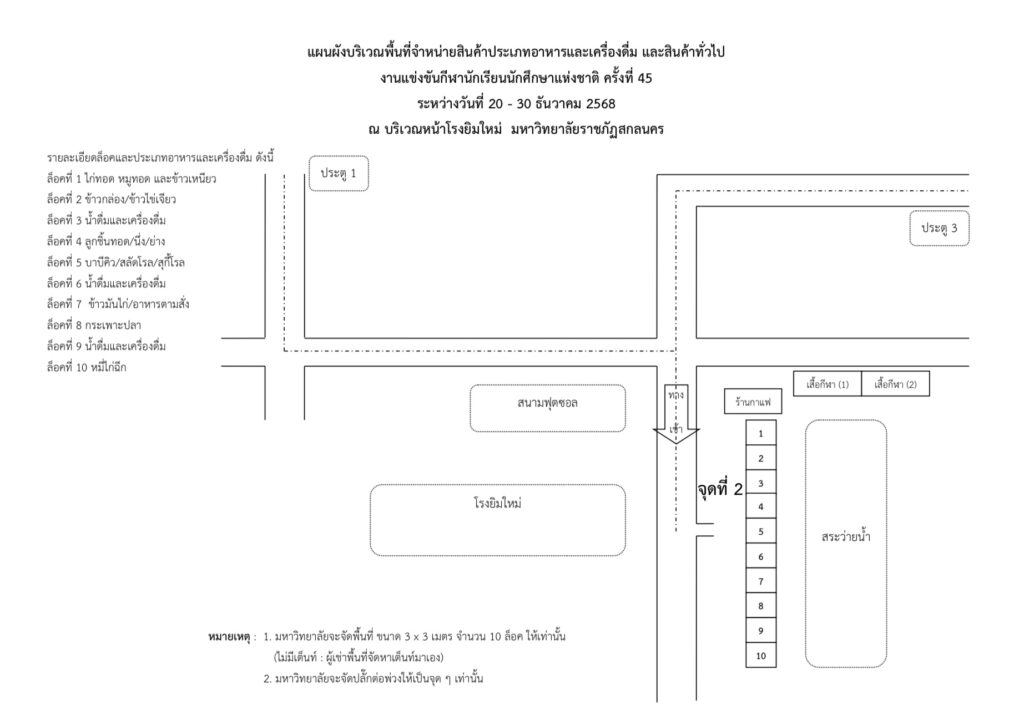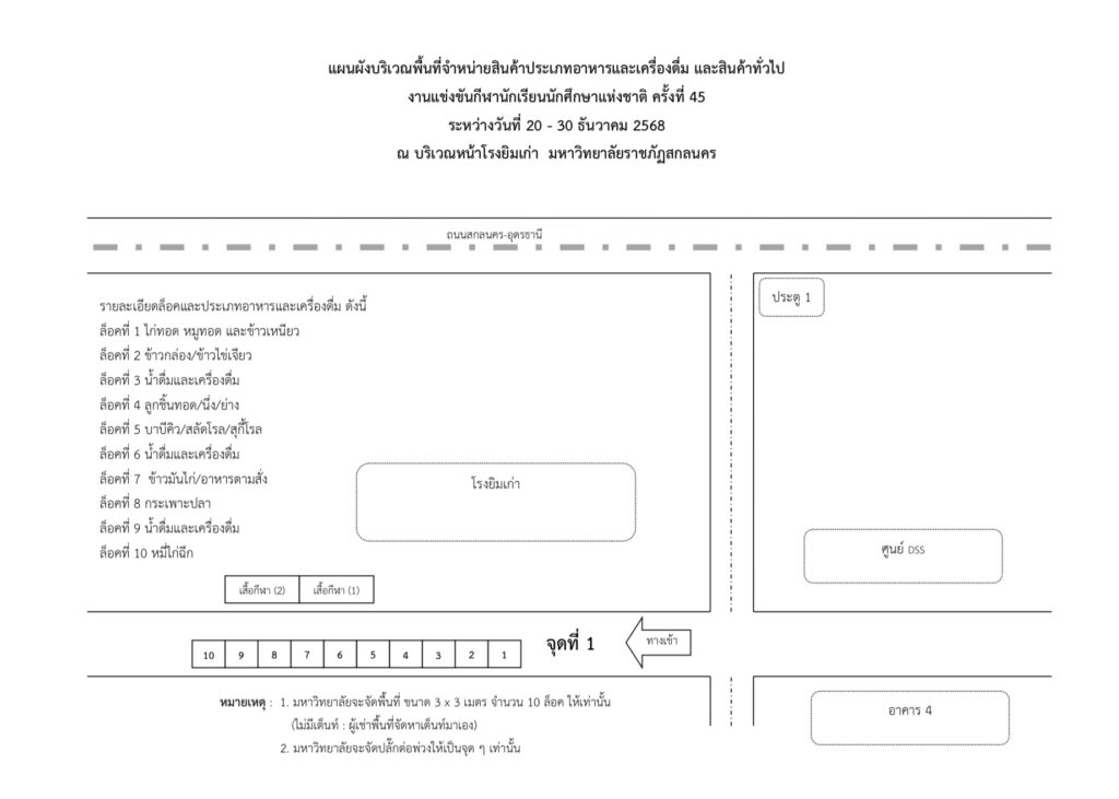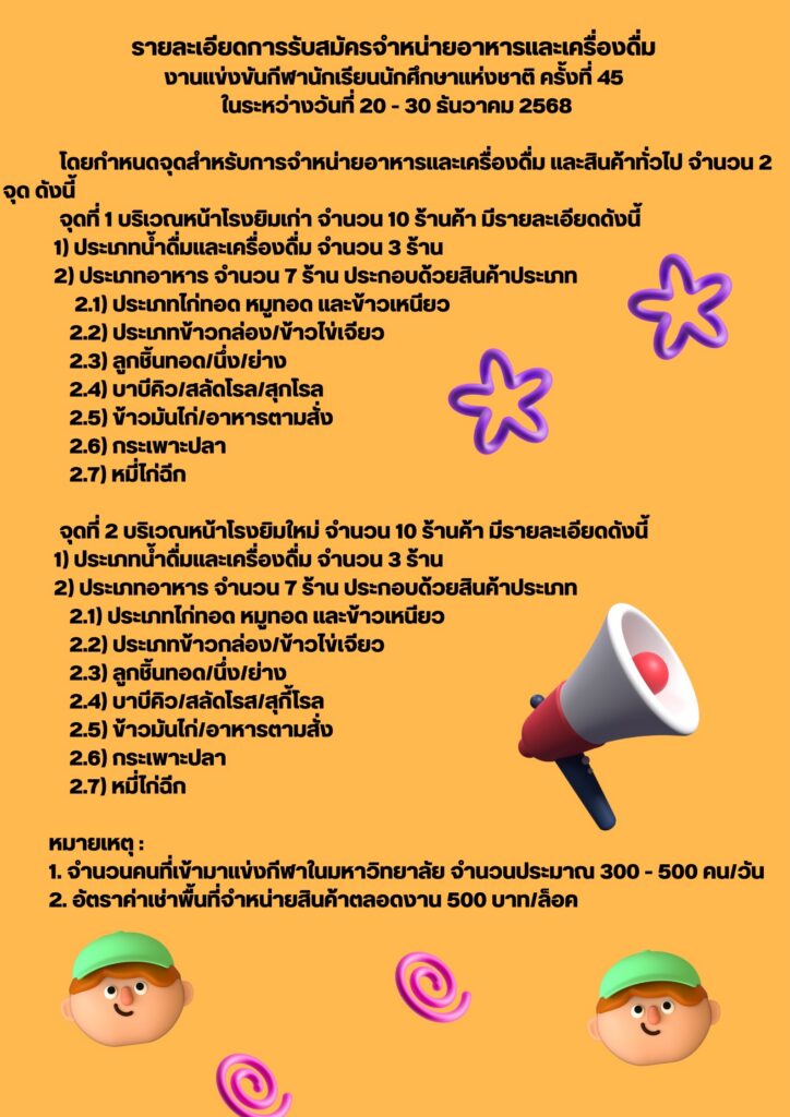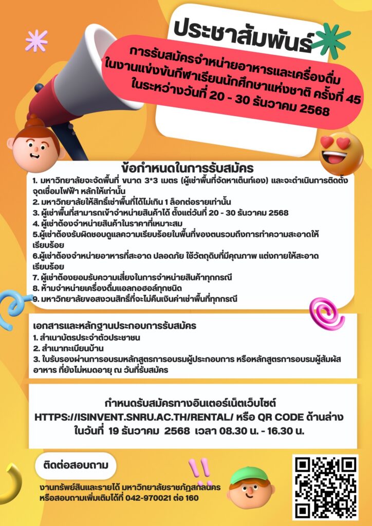 การรับสมัครจำหน่ายอาหารและเครื่องดื่ม ในงานแข่งขันกีฬานักเรียนนักศึกษาแห่งชาติ ครั้งที่ 45 ในระหว่างวันที่ 20 – 30 ธันวาคม 2568 เผยเเพร่เมื่อ 18 ธันวาคม 256818 ธันวาคม 2025 โดย งานทรัพย์สินและรายได้ โดยกำหนดรับสมัคร ในวันที่ 19 ธันวาคม 2568 ตั้งแต่เวลา 08.30 น. – 16.30 น. ผ่านทางอินเตอร์เน็ต https://isinvent.snru.ac.th/rental/ หรือสแกน QR Code รายละเอียดตามเอกสารที่แนบมาพร้อมนี้